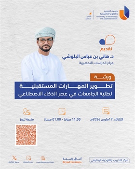ورشة تطوير المهارات المستقبلية لطلبة الجامعات في عصر الذكاء الاصطناعي schedule Wednesday, March 11, 2026 Preparatory Studies Centre Read more