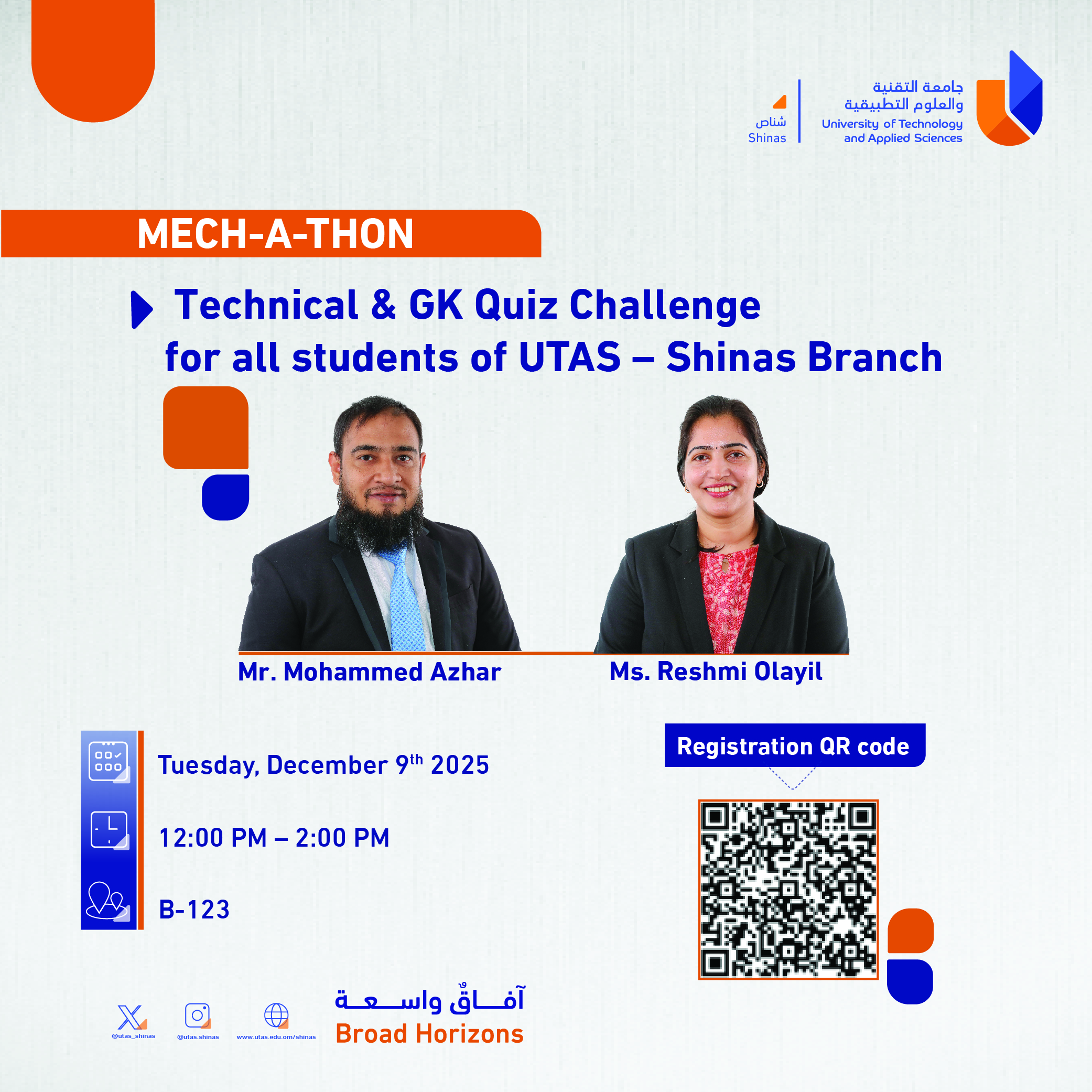 Sunday, December 7, 2025 / Categories: Announcements Technical & GK Quiz Challenge for all students of UTAS - Shinas Branch Previous Article Dynamic Assessments with Calculated MCQs in Moodle Next Article Interaction with Foreign Professor on Research and Development Activities Print 5 Rate this article: No rating