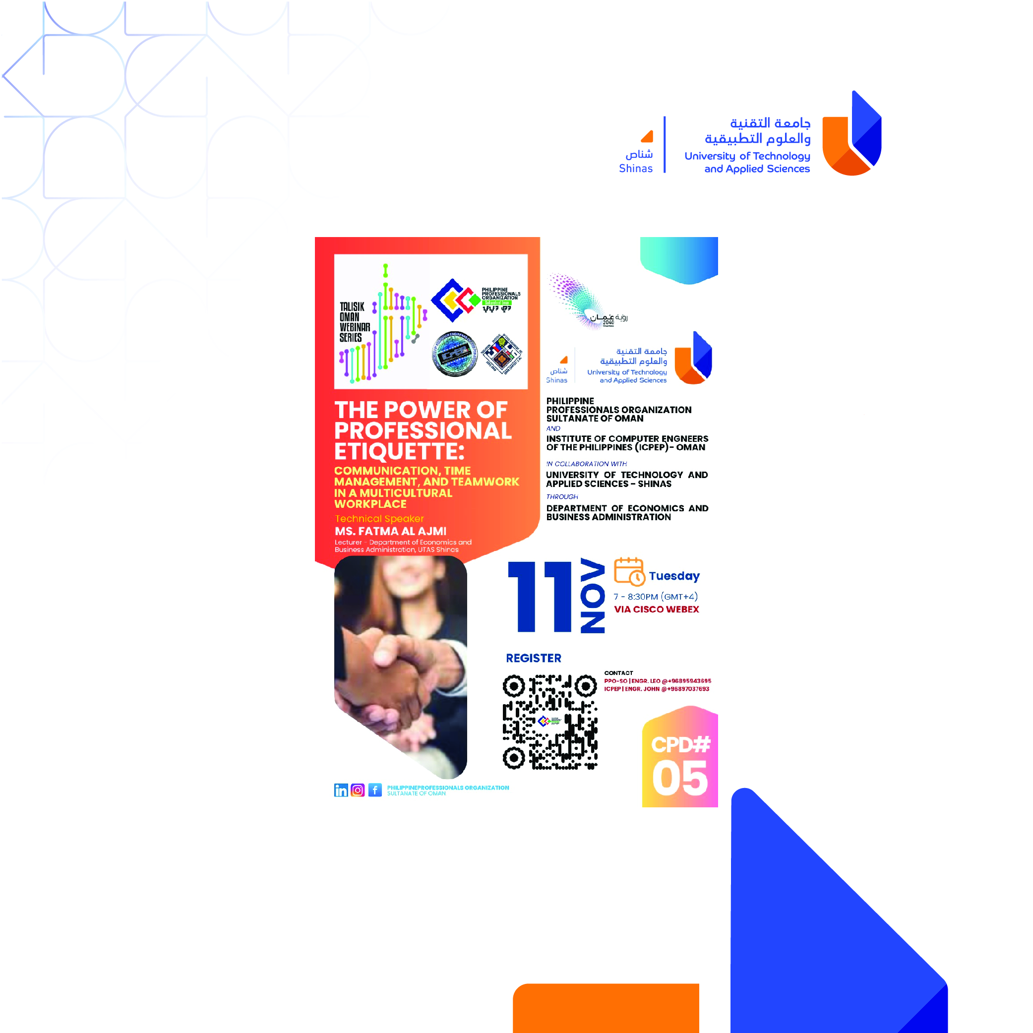 The webinar, titled "The Power of Professional Etiquette: Communication, Time Management, and Teamwork in a Multicultural Workplace," was organized by the Department of Economics and Business Administration (DEBA) through the Community Engagement Committee at the University of Technology and Applied Sciences (UTAS) – Shinas and Philippine Professionals Organization (PPO) in the Sultanate of Oman in collaboration with the Institute of Computer Engineers of the Philippines (ICPEP) - Oman.