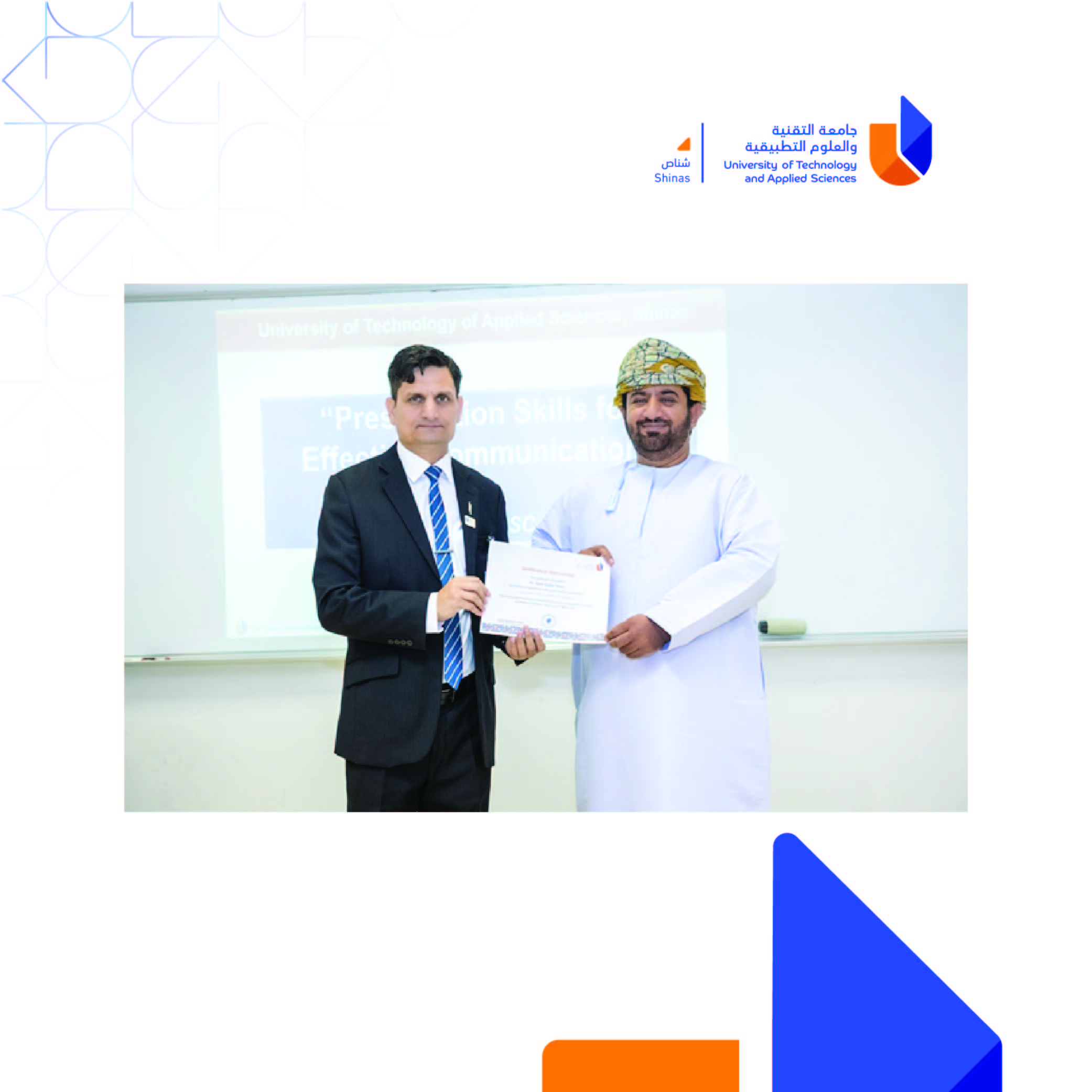 The Community Engagement Committee of the Preparatory Studies Center (PSC) organized a workshop on “Presentation Skills for Effective Communication” on 25th April 2024 at F-Building, UTAS-Shinas Campus. Mr. Basit Sultan Tanoli, English Lecturer, served as the resource speaker. The workshop was attended by 43 students, community members, and alumni. It covered essential topics including overcoming stage fright, structuring presentations, and effective delivery techniques. Participants engaged actively, appreciating the practical insights shared to them. Mr. Basit emphasized the importance of communication skills in today's world and expressed satisfaction with the attendees' enthusiasm. Feedback from participants was overwhelmingly positive, highlighting the workshop's relevance and value for personal and professional development. In recognition of his exceptional contribution to the recent Presentation Skills Workshop, Mr. Basit Sultan Tanoli was presented with a Certificate of Appreciation by Mr. Salim AlBadi, Community Engagement Committee Coordinator. UTAS-Shinas remains committed to offering such enriching opportunities, ensuring its community is equipped with essential skills for success.