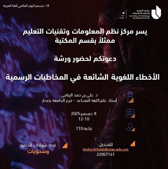 ورشة الأخطاء اللغوية الشائعة في المخاطبات الرسمية schedule Sunday, November 30, 2025 Announcement Read more