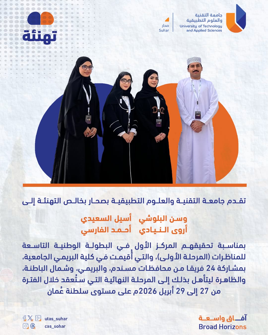 Monday, April 6, 2026 / Categories: Announcement تهنئة Previous Article لوحة الشرف لجامعة التقنية والعلوم التطبيقية بصحار خريف 2025 Next Article دمك امل فلا تبخل به Print 8 Rate this article: 5.0