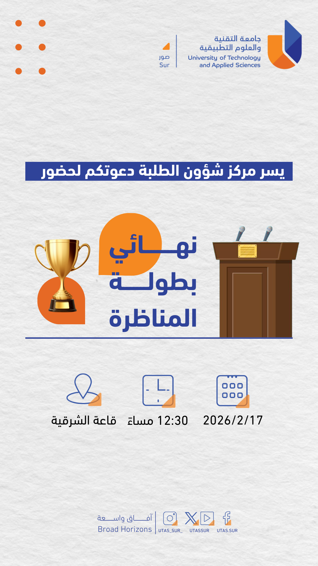 Sunday, February 15, 2026 / Categories: Announcements, Student Activities دعوة حضور نهائي بطولة المناظرات Previous Article فعالية اليوم العالمي للصحة النفسية Next Article ورشة توعوية عن أمن التواصل الاجتماعي Print 13